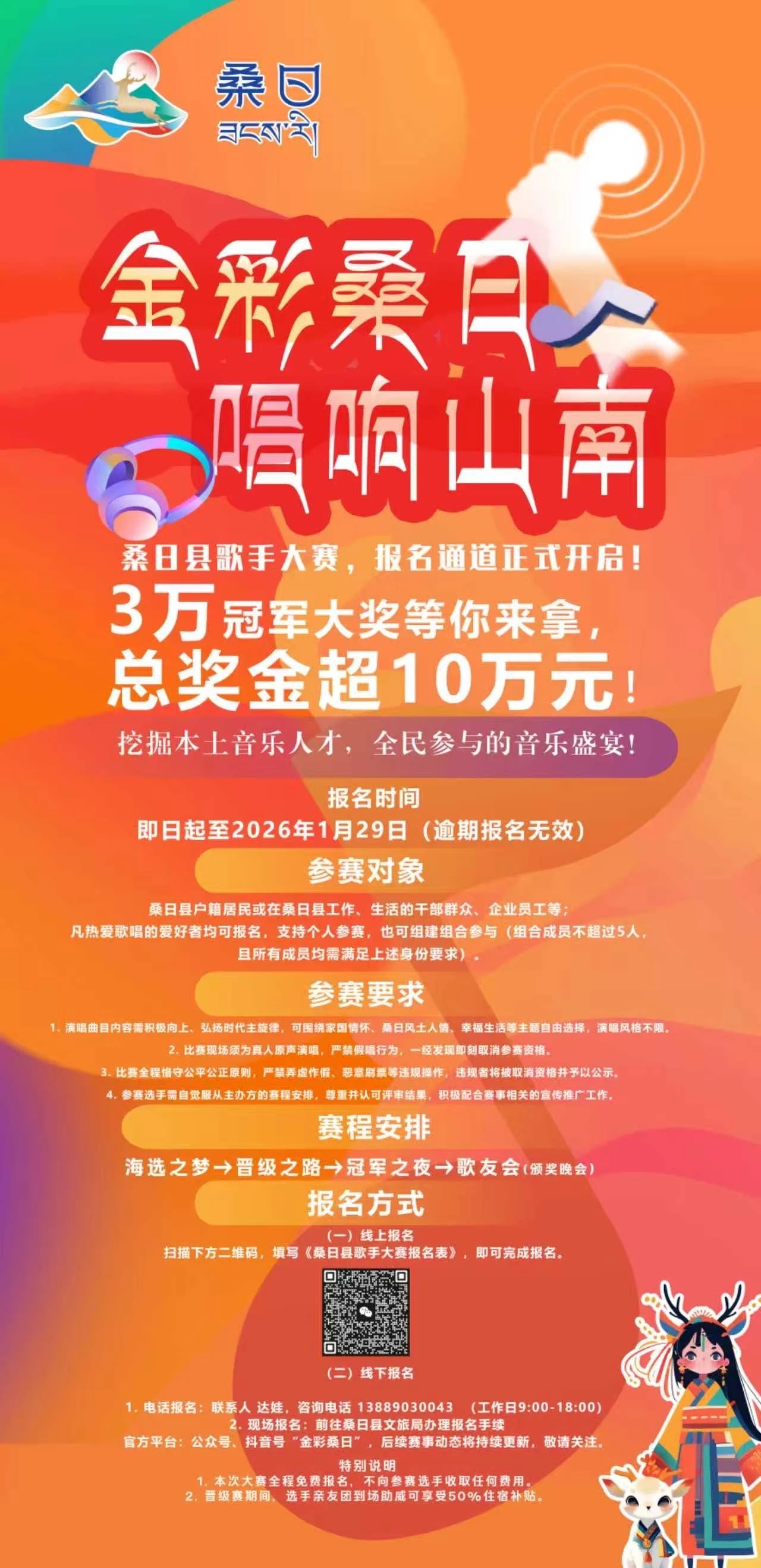为深入推进“文旅活县”战略,挖掘桑日本土音乐人才,搭建全民参与的文化展示平台,丰富全县群众精神文化生活,进一步擦亮“金彩桑日”文旅品牌,积极打造远近闻名的“文旅圣地”,特策划举办本次歌手大赛。