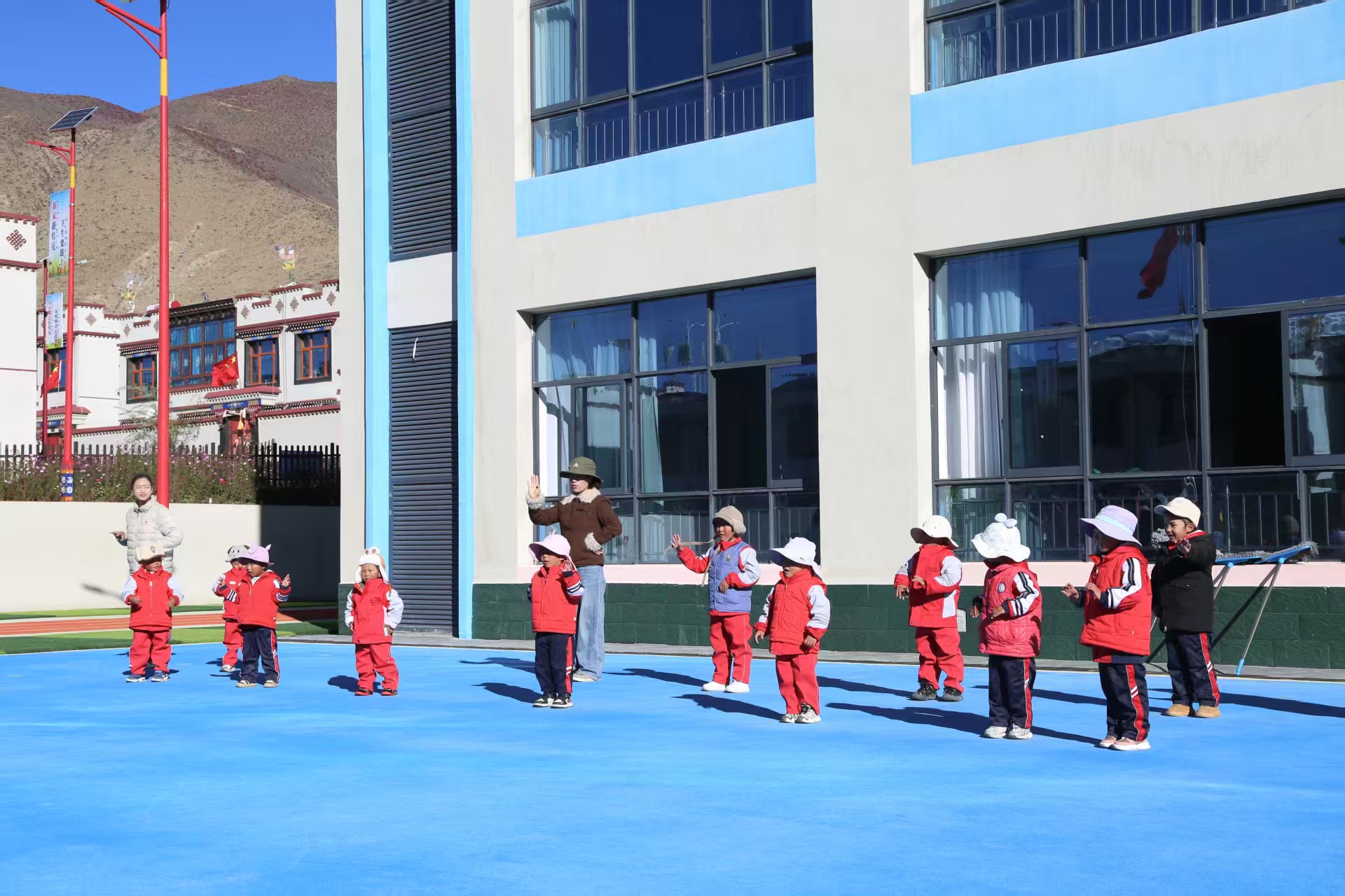在扎嘎新村幼儿园,孩子们正跟着音乐在院子里尽情舞动,与老师一同跳着课间操,欢笑声填满了整个校园。