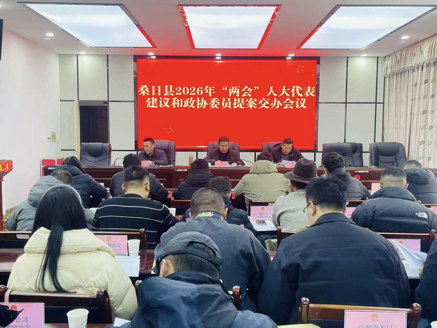 2月3日,桑日县召开2026年“两会”代表意见建议和委员提案交办会议。县人民政府副县长刘积庭主持会议,县人大常委会副主任旦巴旺久、县政协副主席尼玛次仁出席会议,县政府各承办单位主要负责同志参加会议。